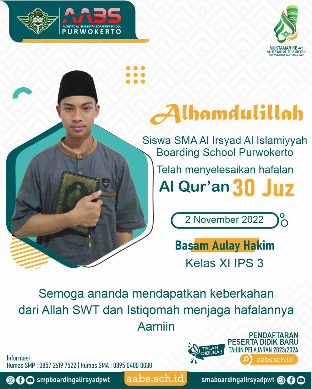 Barakallah, Bassam Aulay Hakim, siswa SMA Al Irsyad Al Islamiyyah Boarding School (AABS) Purwokerto telah khatam hafalan 30 juz Al-Qur’an.