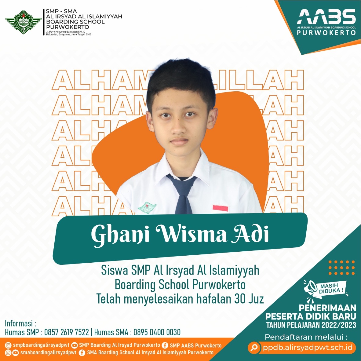 Barakallah tabarakallah ananda Ghani Wisma Adi, siswa SMP Al Irsyad Al Islamiyyah Boarding School (AABS) Purwokerto telah menyelesaikan hafalan 30 juz.
