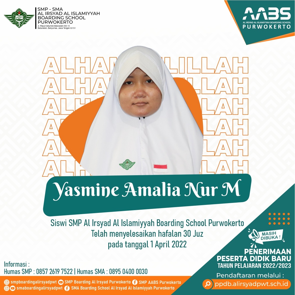 Alhamdulillah ananda Yasmine Amalia Nur M., siswi SMP Al Irsyad Al Islamiyyah Boarding School (AABS) berhasil merampungkan hafalan 30 juz Al-Qur’an.