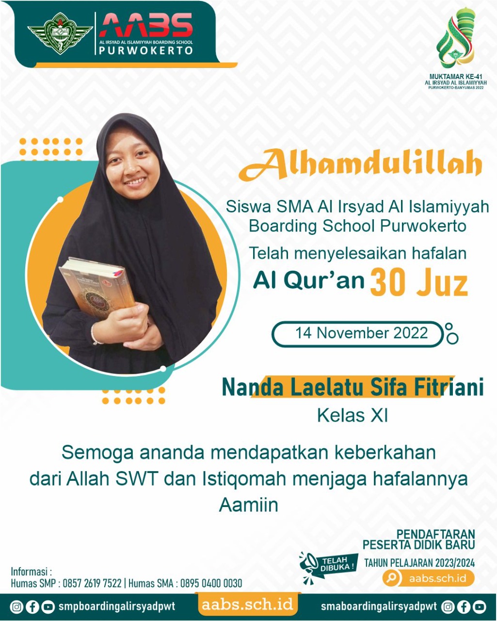 Ananda Laelatu Sifa, siswi kelas XI SMA AABS tersebut telah khatam hafalan 30 juz pada 14 November 2022.