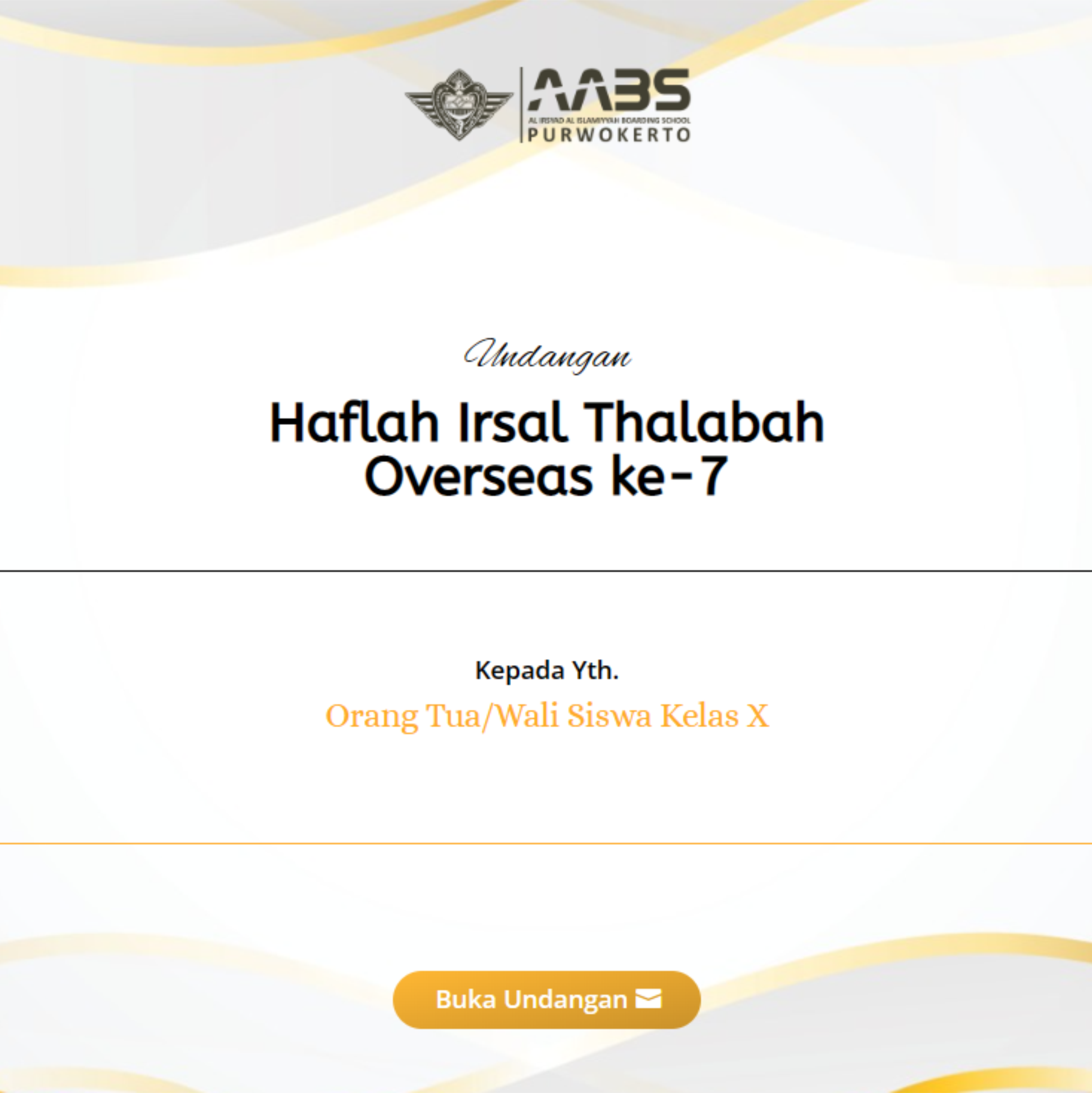 Dengan hormat, Kepala SMA Boarding School Al Irsyad Al Islamiyyah Purwokerto mengharap kehadiran Bapak/Ibu/Saudara pada acara Haflah Irsal Thalabah Overseas ke-7 SMA Boarding School Al Irsyad Al Islamiyyah Purwokerto, yang akan diselenggarakan pada :