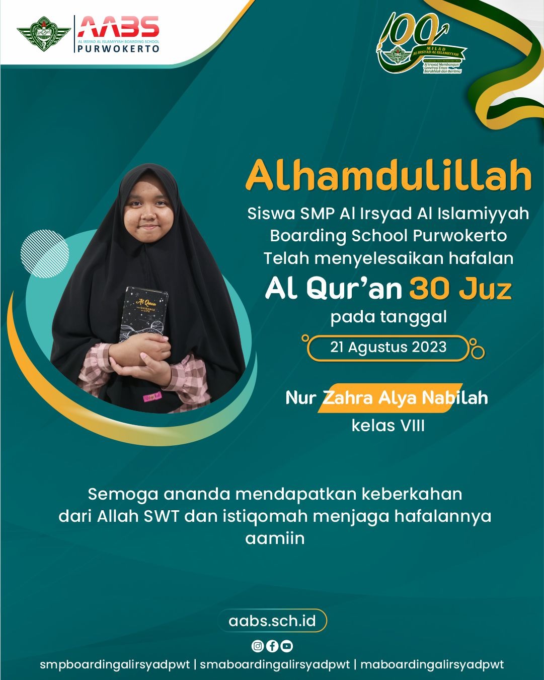 Purwokerto – Alhamdulillah! ananda Nur Zahra Alya Nabilah, sisiwi kelas VIII SMP Al Irsyad Al Islamiyyah Boarding School (AABS) Purwokerto khatam hafalan 30 juz Al-Quran (22/08).